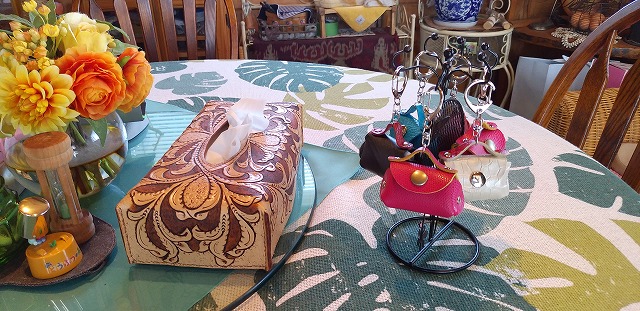 ![]() ティッシュケースは、打ち出し模様に手をかけています。 キーホルダーは、ハンドバックをキーホルダーにしてみました。 |
